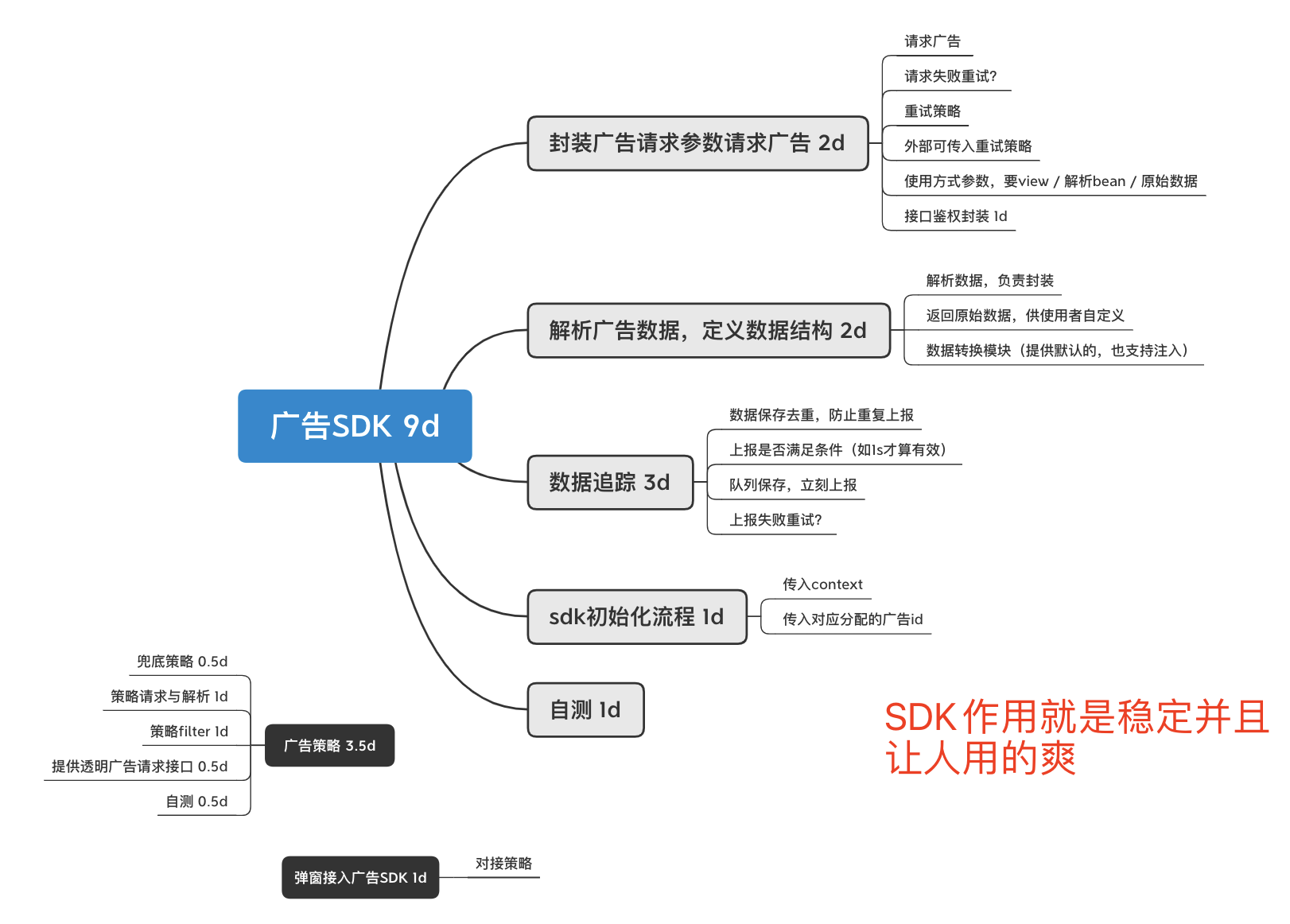 这两天主要是处理一些杂事,完成了卡片入口和小岛入口的添加以及埋点工作。2号设计了一下广告SDK主要分哪些,做了一个粗略排期,具体模块大致如下: