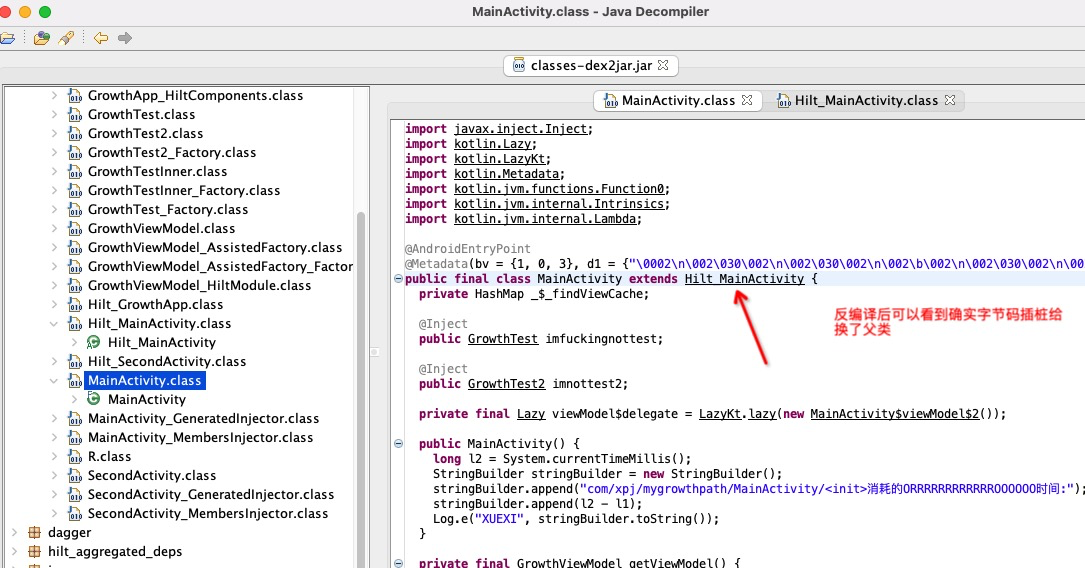最终调用到哪里呢,是这个 Hilt_MainActivity 生成的对应类,这个类最终在哪里调用目前还木有发现。。但是他调用的是在onCreate里调用了inject方法。