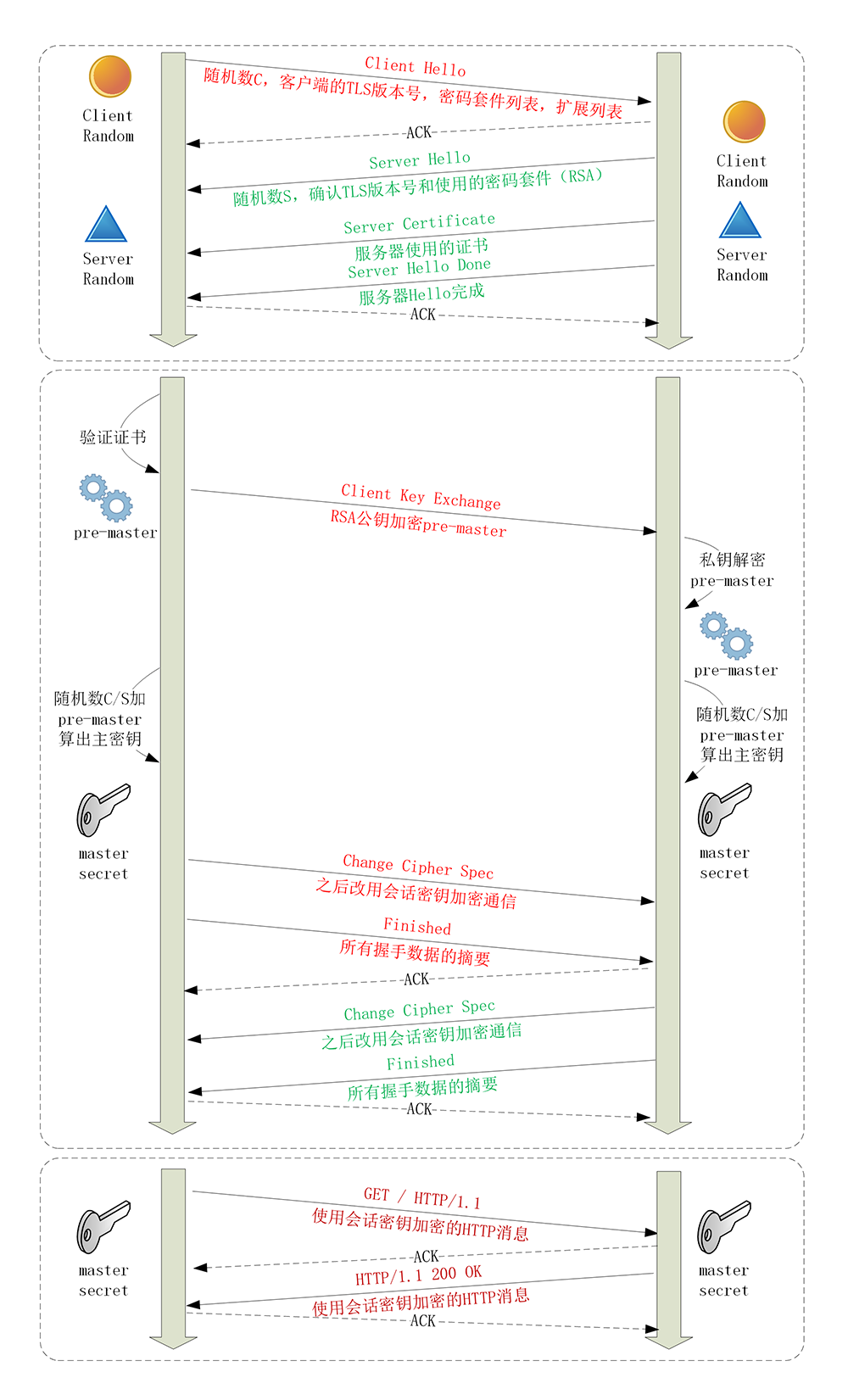 https的整体握手建立连接的过程,我们可以看到与Http最大的区别就是中间多了SSL/TLS的握手部分。