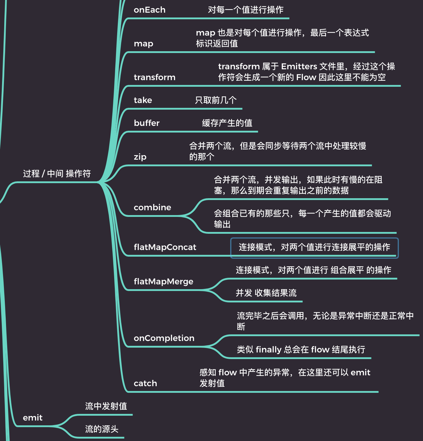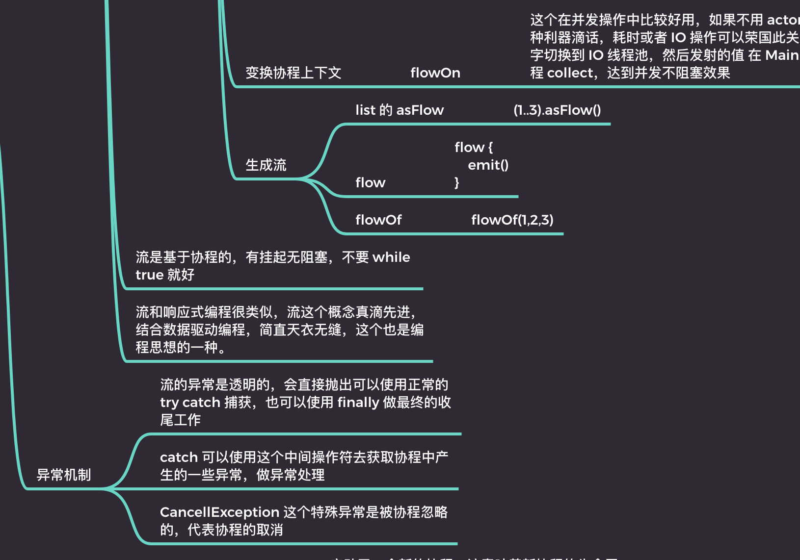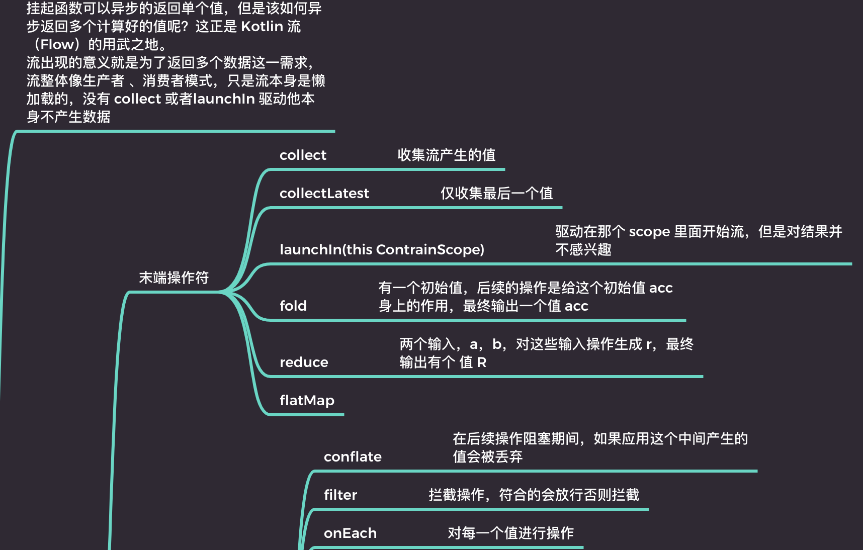 kotlin 的 flow 是基于协程的,是协程并发的一种,flow 是为了解决协程只发送一个值的问题,达到连续发射的目的,流的特点是拥有大量的操作符,流是连续的,经过了各种中间操作符的控制会达到得到最终结果的一种方式。