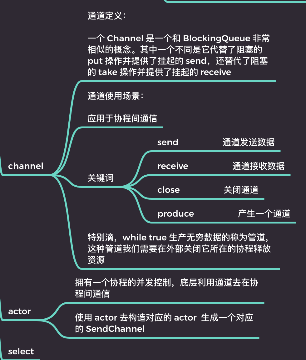 Channel 可以用于协程间通信,如果构建一个不关闭的通道那就是管道,通道是基于协程的,取消的时候除了调用其自身的 cancel 还可以调用 coroutineContext cancelChildren。