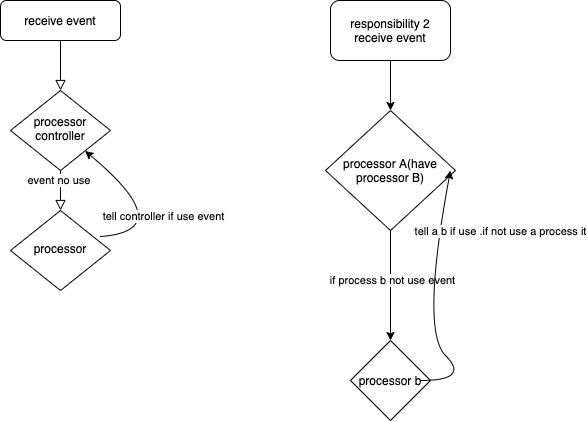 | 该模式适合应用场景为对一个目标事件的处理是互斥的,也就是说这个如果某一事件有人处理了,需要告诉下游处理者改事件已经被消费,下游根据这个指示就不做多余处理 | 正常情况下是事件的消费者之间是有关联的,也就是说假如有 a b 事件处理者,例如 a 持有 b, 那么可以在 a 中首先掉一共 b 消费或者处理改事件的方法,如果该方法标明自己已经处理,那么 a 就不会继续改事件 |